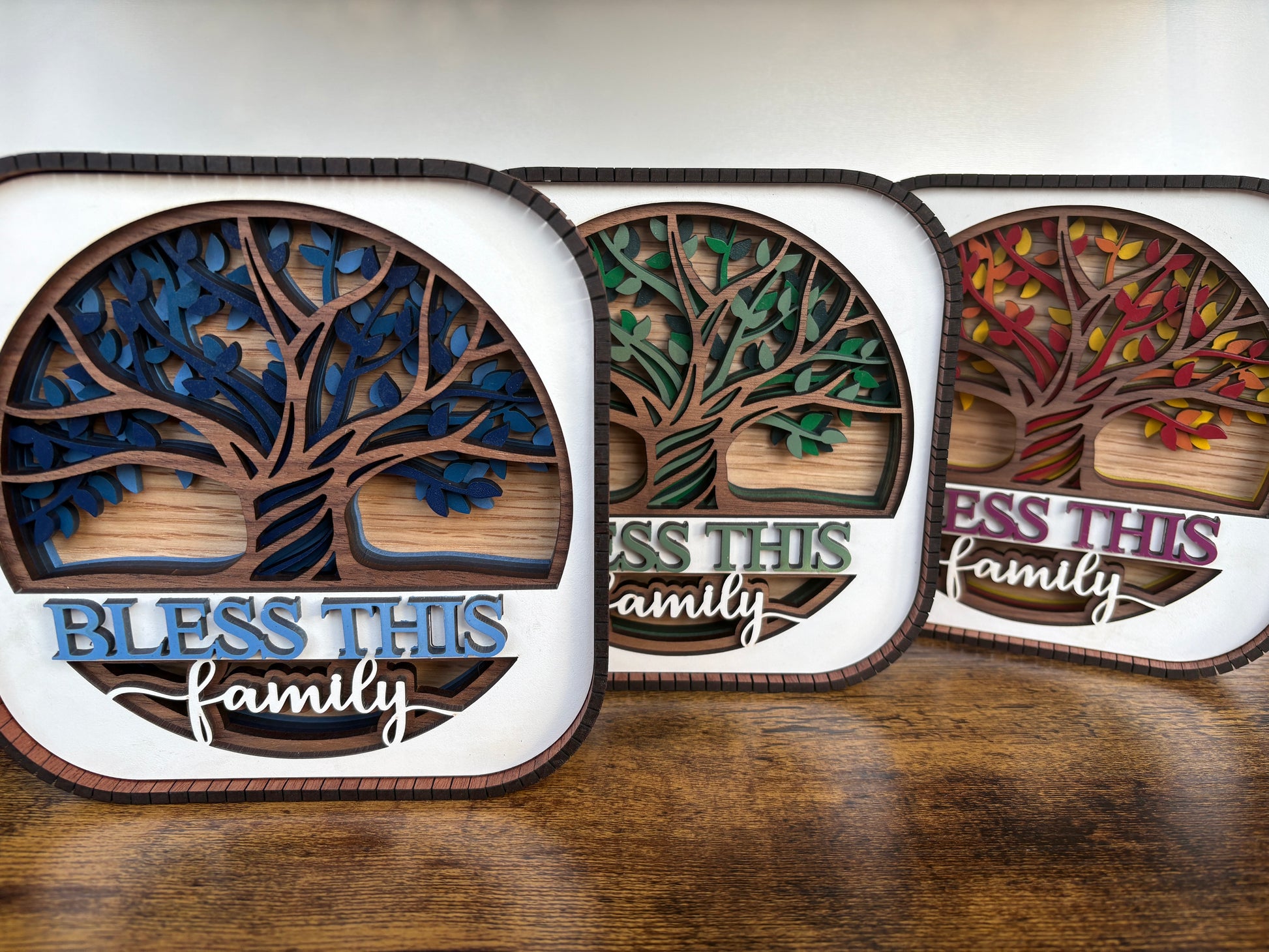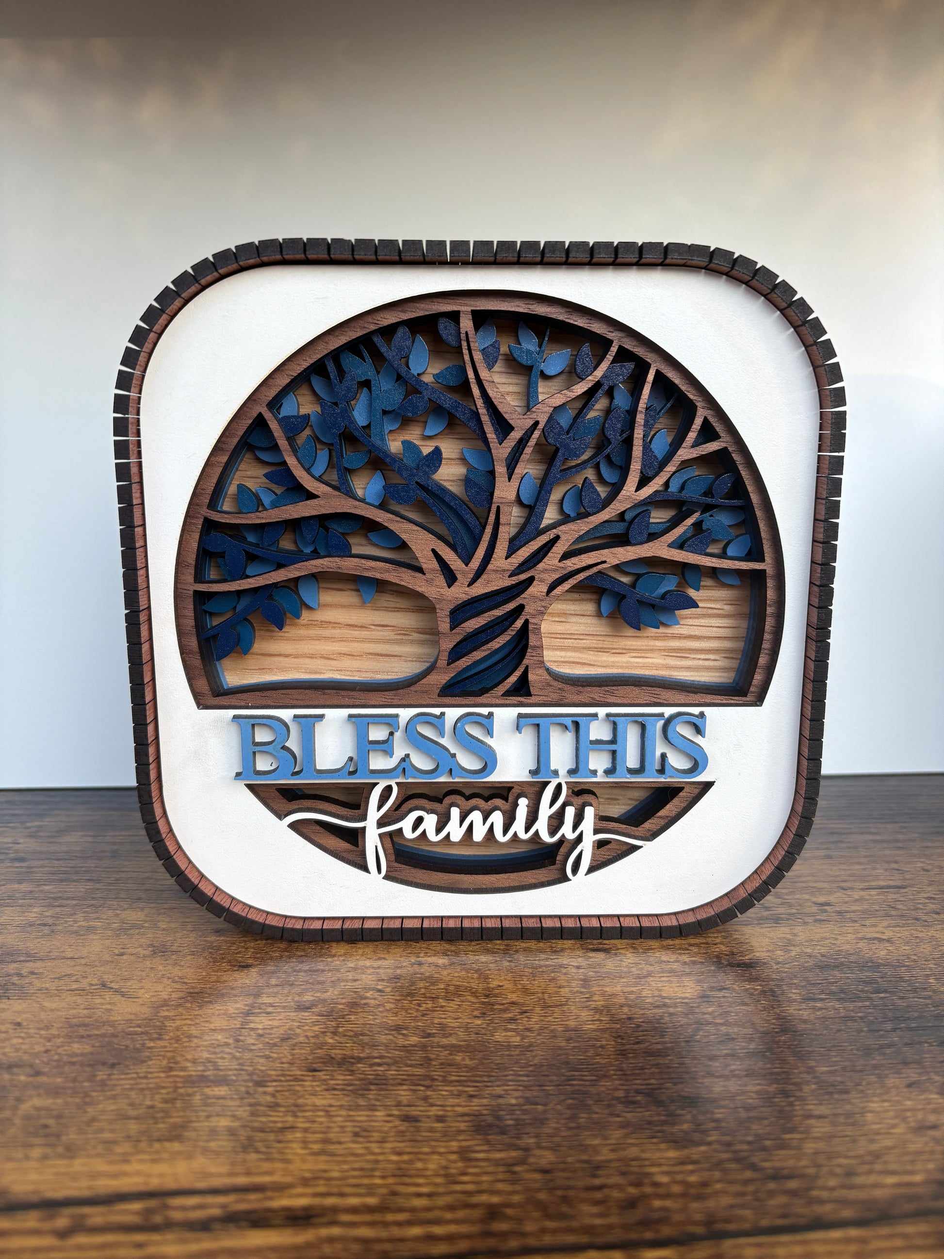 Celebrate family with the Bless This Family Shelf Sitter, crafted from six layers of rich walnut wood. This 5.75-inch charming piece features live wood edges and branching limbs adorned with interchangeable leaves, letting you switch up the look for every season. A playful Tree of Life design brings warmth and personality to any shelf or mantel, reminding everyone that family is where the heart grows.